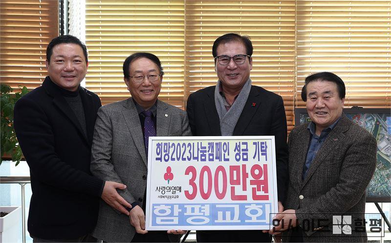전남 함평군 ‘희망2023 나눔캠페인’에 각계각층의 따뜻한 기부의 손길이 이어져 추운 겨울 훈훈함을 더하고 있다. 함평군은 “대한예수교 장로회 함평교회(목사 김운창)에서 지난 20일 ‘희망2023나눔캠페인’ 이웃돕기 성금으로 3백만원을 기탁했다”고 21일 밝혔다. 또한 19일에는 ▲(주)농업회사법인 함평애푸드(대표