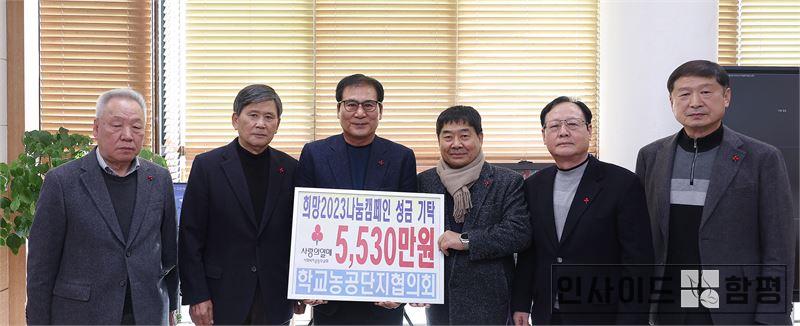 전남 함평군은 (사)학교농공단지협의회(회장 김길현)에서 지난 27일 ‘희망2023 나눔캠페인’ 이웃돕기 성금으로 5,530만원을 기탁했다고 28일 밝혔다. (사)학교농공단지협의회는 매년 연말연시를 맞아 이웃돕기 성금을 기탁해 오고 있으며, 지난달에는 저소득 취약가구를 위해 KF마스크 10,000장을 기부한 바 있다.