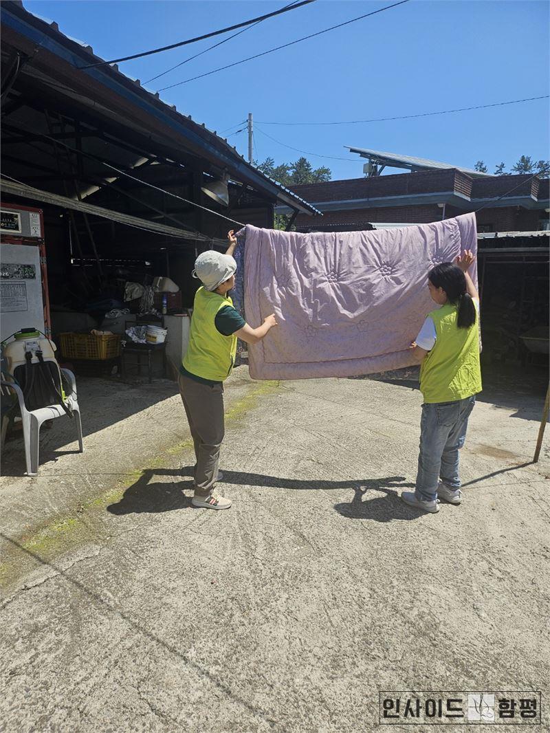 전남 함평군 자원봉사센터는 지난 18일 함평지역자활센터와 연계해 위생이 취약한 독거 어르신들 가정을 방문, ‘오늘은 빨래 하는 날!’ 이불 세탁 봉사를 실시했다. ‘오늘은 빨래 하는 날!’ 세탁 봉사는 쾌적한 환경에서 건강한 여름 나기를 위한 함평군 자원봉사센터 프로그램이다. 빨래가 끝난 이불을 전달받은 한 어르신