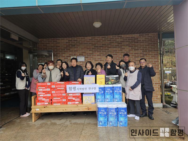 함평지역발전연구원(원장 옥부호)은 복지법인 성애원과 정겨운 뜰안을 방문하여 회원들의 성금으로 준비한 작은 성의를 복지법인 관계자들에게 전달했다.함평지역발전연구원은 "지역봉사와 더불어 함평읍 학교면 엄다면에 걸친 함평중심지 생활 개선을 위한 도시재생 및 곤충엑스포 일대 관광과 전원주택 개선사업, 함평만 해안 개발사업, 신