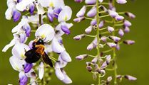 22일 함평읍 함평리 한 주택 담장에 연보랏빛 꽃망울을 터트린 등꽃 주위를 어리호박벌이 분주히 날아다니며 꿀을 따고 있다.