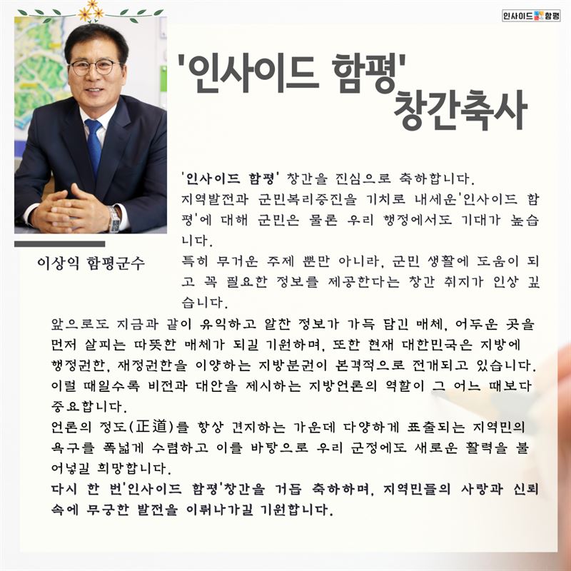 이후 11월 13일 ‘인사이드 함평’본지 창간을 기념하여 당선 이후, 직접 군정을 운영해본 소감과 더불어 앞으로의 군정 방향에 대해 이야기를 나누고자 했으나, 코로나19로 인해 부득이하게 서면으로 제47대 이상익 함평군수의 인터뷰를 진행했다.