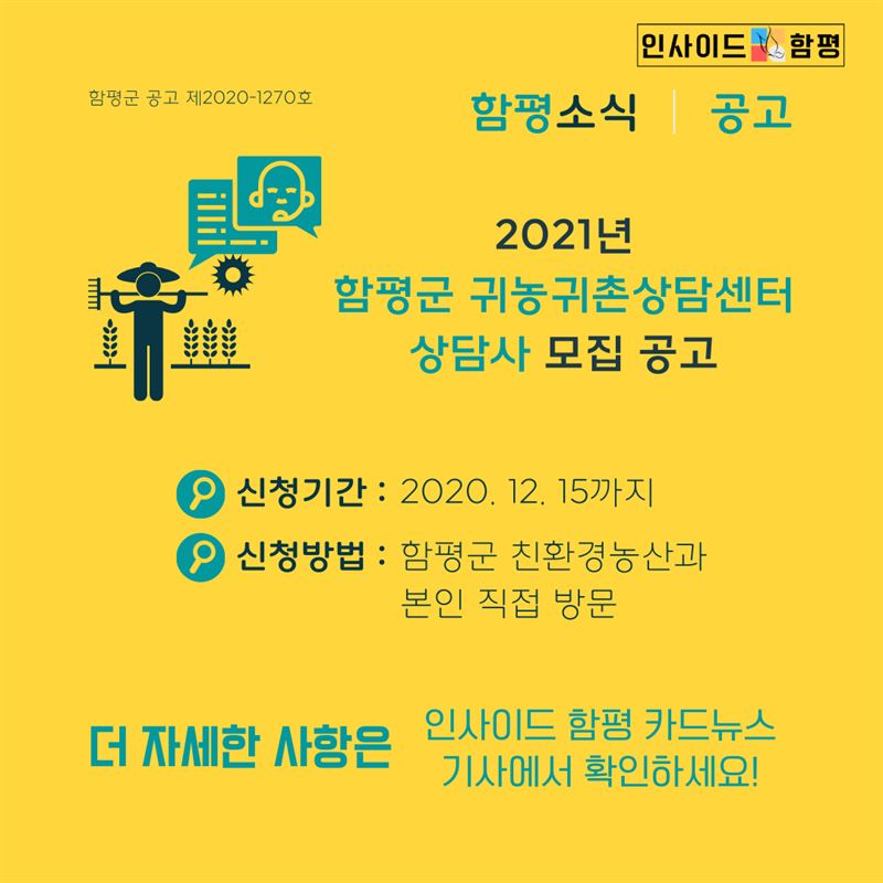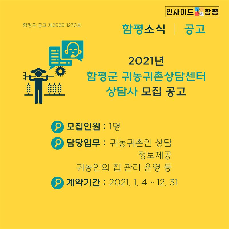 모집분야는 귀농귀촌 상담센터 상담사로 총 1명을 채용할 계획이며 계약기간은 내년 1월 4일부터 12월 31일까지로 근로자는 (예비)귀농귀촌인 상담, 정보제공, 귀농인의 집 관리 운영과 그 밖에 귀농귀촌 관련 부여받음 업무를 수행하게 될 예정이다.