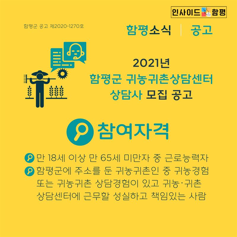 또한 만 18세 이상 만 65세 미만자 중 근로능력자이면서 함평군에 주소를 둔 귀농귀촌인 중 귀농경험 또는 귀농귀촌 상담경험이 있고 귀농귀촌 상담센터에 근무할 성실하고 책임감 있는 자를 채용한다.