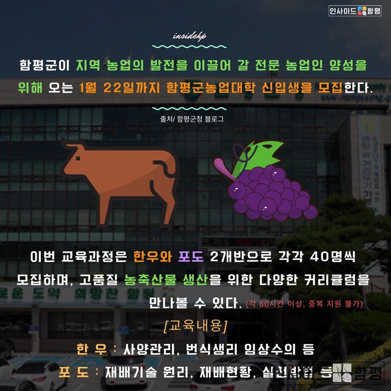 함평군이 지역 농업의 발전을 이끌어 갈 전문 농업인 양성을 위해 오는 1월 22일까지 함평군농업대학 신입생을 모집한다고 밝혔다.