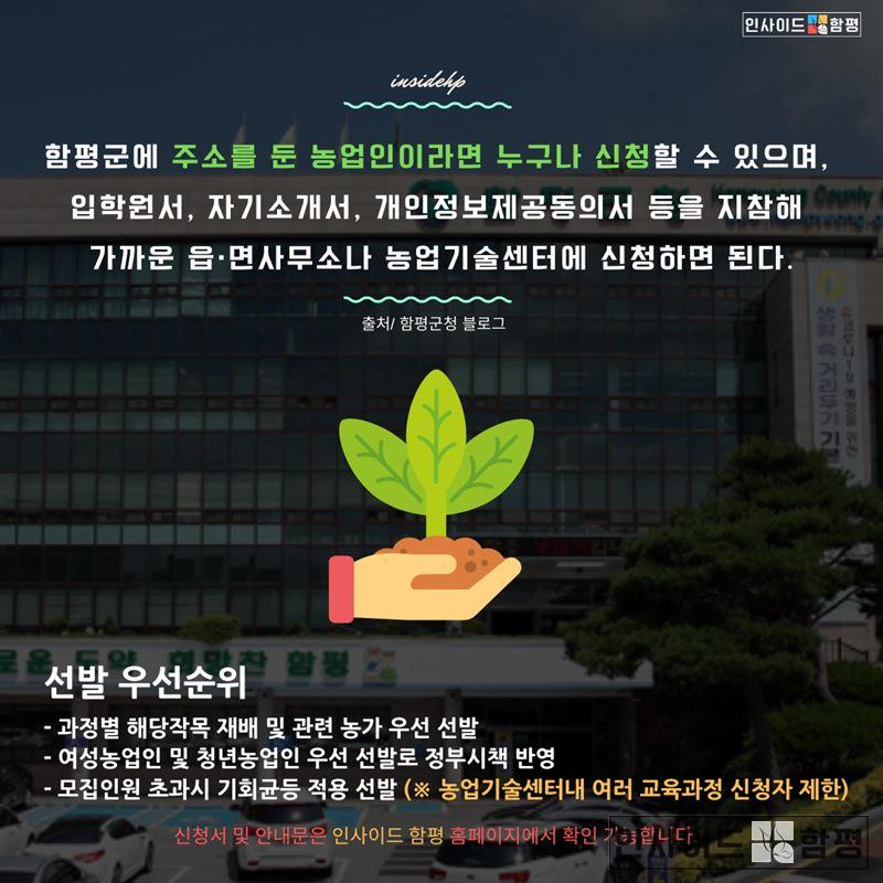 참가 자격은 함평군에 주소를 둔 농업인이라면 누구나 신청 가능하며, 힙학원서, 자기소개서, 개인정보제공동의서를 지참하여 가까운 읍·면사무소 또는 농업기술센터에 신청하면 된다.