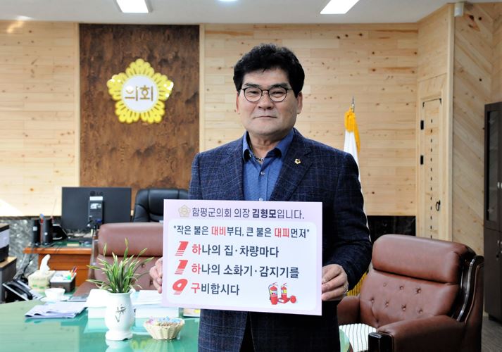 김형모 의장은 김재승 함평소방서장의 지명을 받아, ‘1(하나의 집차량마다), 1(하나의 소화기감지기를), 9(구비합시다)’가 적힌 팻말을 들고 캠페인에 참여했다.