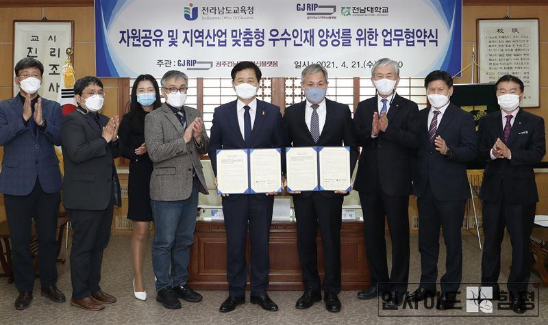 전라남도교육청과 전남대학교는 21일(수) 전남대학교 총장실에서 지자체-대학 협력 기반 지역혁신사업 관련, 고교-대학 교류 및 교육 프로그램 연계를 위한 업무협약(MOU)을 체결했다.