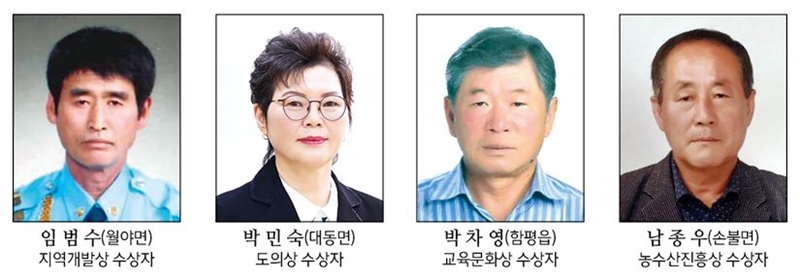 올해 수상자는 ▲지역개발상 임범수 씨 ▲도의상 박민숙 씨 ▲교육문화상 박차영 씨 ▲농수산진흥상 남종우 씨 등 총 4명이다.