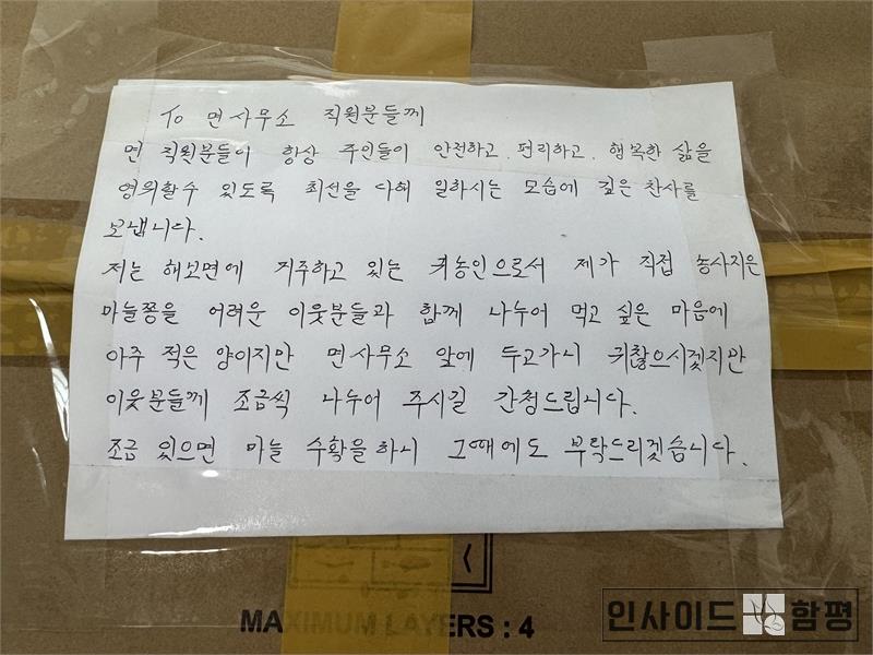 기부자는 자신을 해보면에 거주하는 귀농인이라 밝히며 “제가 직접 농사지은 마늘종을 어려운 이웃분들과 함께 나누어 먹고 싶은 마음에 면사무소 앞에 두고 갑니다. 귀찮으시겠지만 이웃분들께 조금씩 나누어 주시길 간청드립니다”라는 따뜻한 내용의 편지를 남겼다.